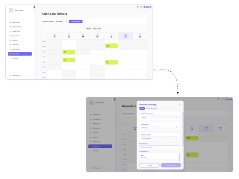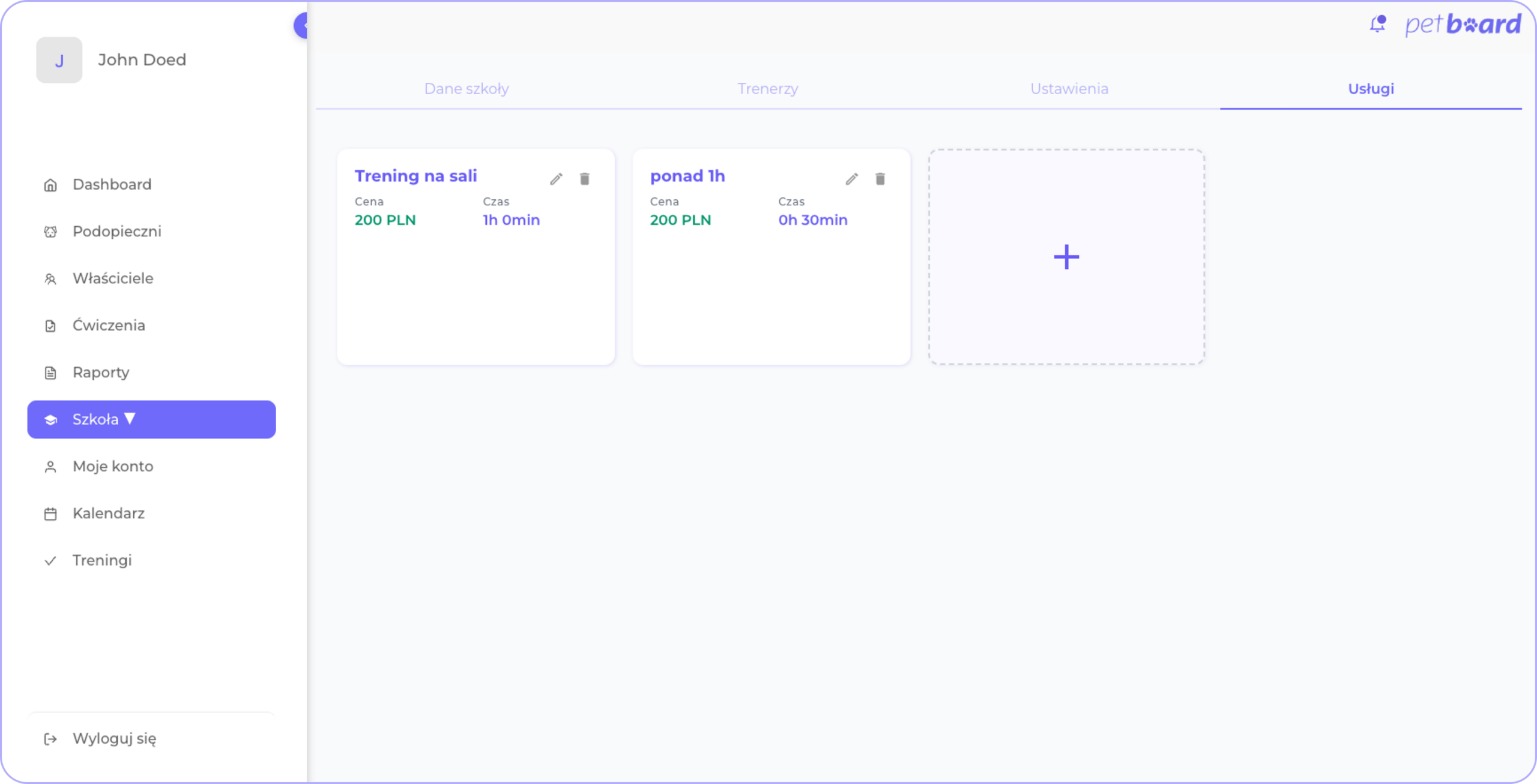 Możesz ustawić rodzaj treningu jak np. “Trening w plenerze”, “Wizyta domowa” oraz określić czas trwania usługi. Następnie właściciel będzie mógł w kalendarzu sam zapisać się na to, co mu odpowiada. Jeśli szkoła ma siedzibę i więcej niż jedną salę, możesz również dodać je w aplikacji.