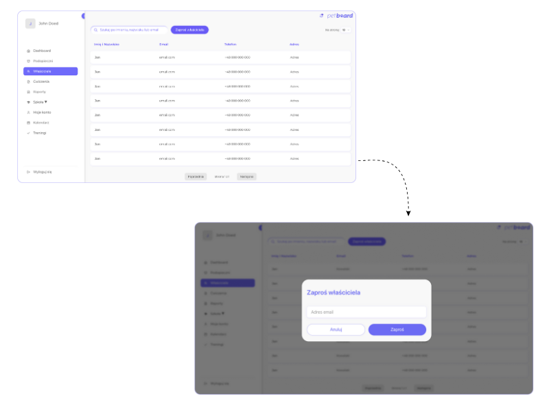 Dodaj właściciela zwierzęcia przechodząc do zakładki Właściciele, a następnie kliknij “Zaproś właściciela”. Zostanie wysłany mail z linkiem, który właściciel zwierzęcia musi zaakceptować.
